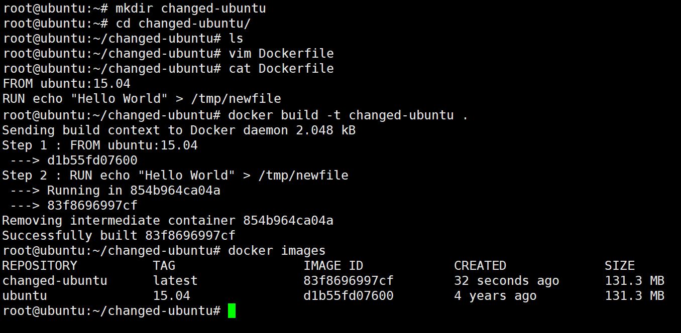 接下来,以ubuntu:l5.04 镜像为基础镜像,创建一个名为changed-ubuntu 的镜像。这个镜像只是在镜像的/tmp文件夹中添加一个写了"Hello world"的文件。可以使用下面的DockerFile来实现。