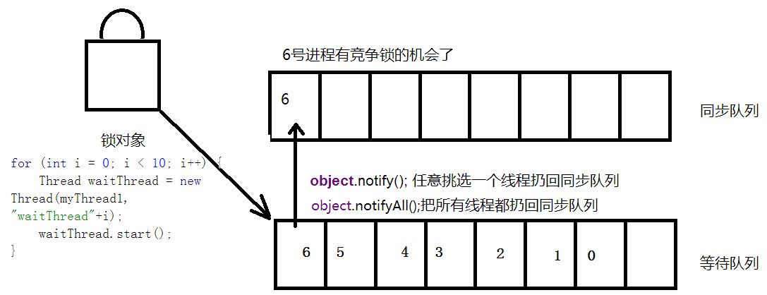 每个锁对象都有两个队列,一个等待队列一个同步队列,同步队列存储获取锁失败的线程,等待队列存储调用wait()等待的线程,将线程唤醒实际上是将处于等待队列的线程移动到同步队列去竞争锁