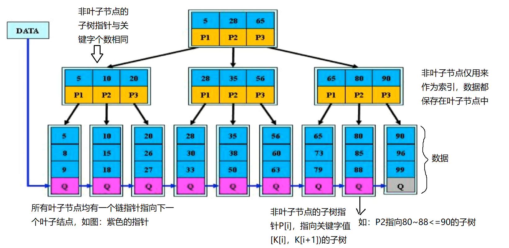 - 所有叶子节点均有一个链指针指向下一个叶子结点