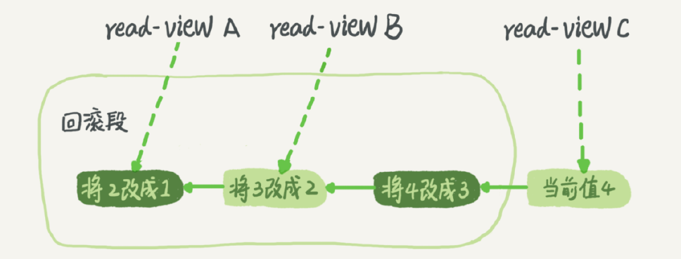 在MySQL中,实际上每条记录在更新的时候都会同时记录一条回滚操作。记录上的最新值,通过回滚操作,都可以得到前一个状态的值,假设一个值从 1 被按顺序改成了 2、3、4,在回滚日志里面就会有类似下面的记录: