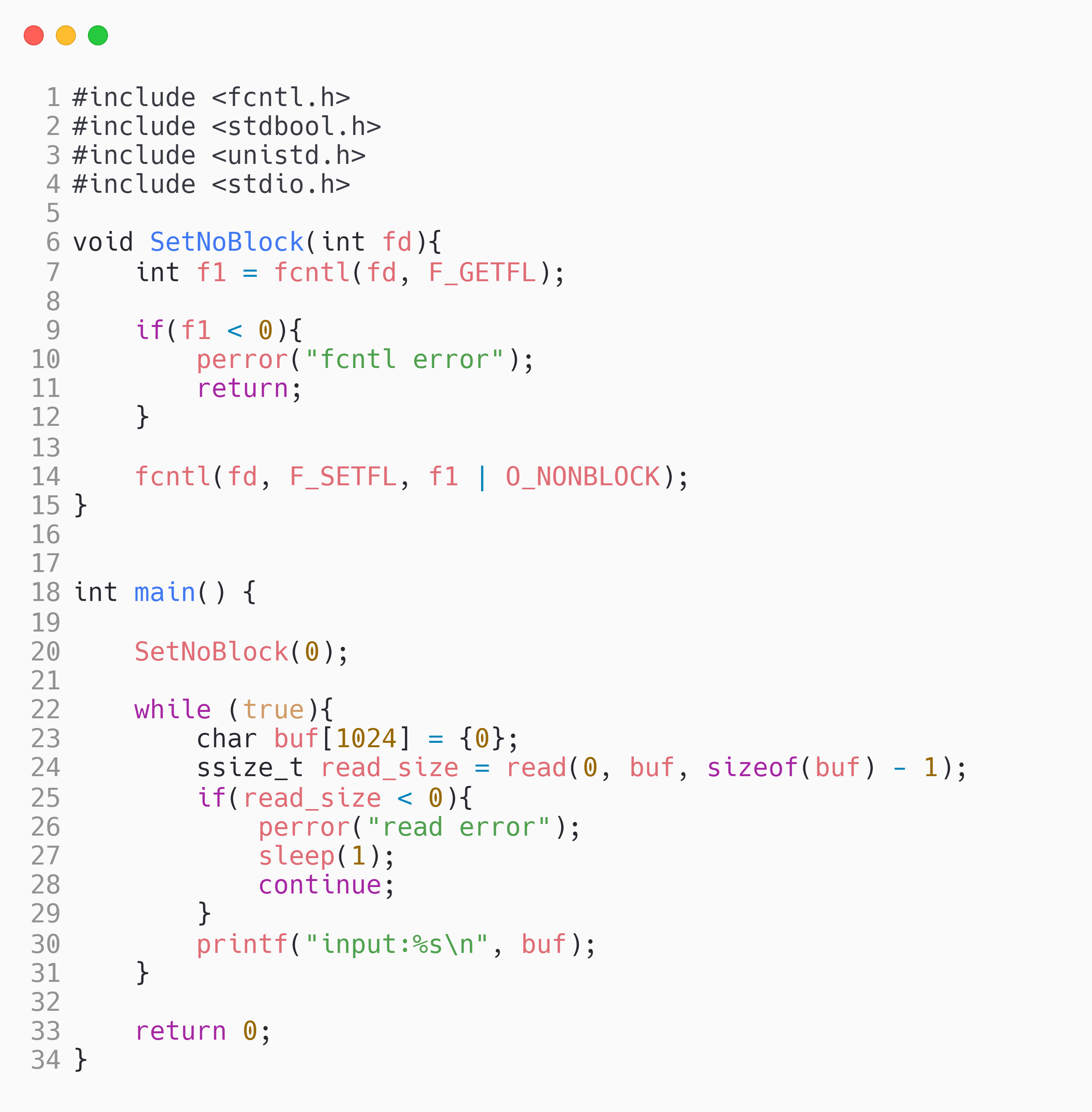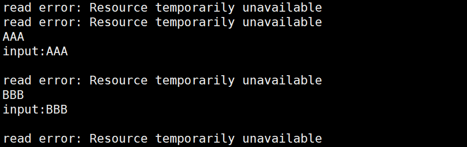 使用F_GETFL将当前的文件描述符的属性取出来(这是一个位图),然后再使用F_SETFL将文件描述符设置回去。设置回去的同时,加上一个O_NONBLOCK参数。下面使用轮询方式读取标准输入: