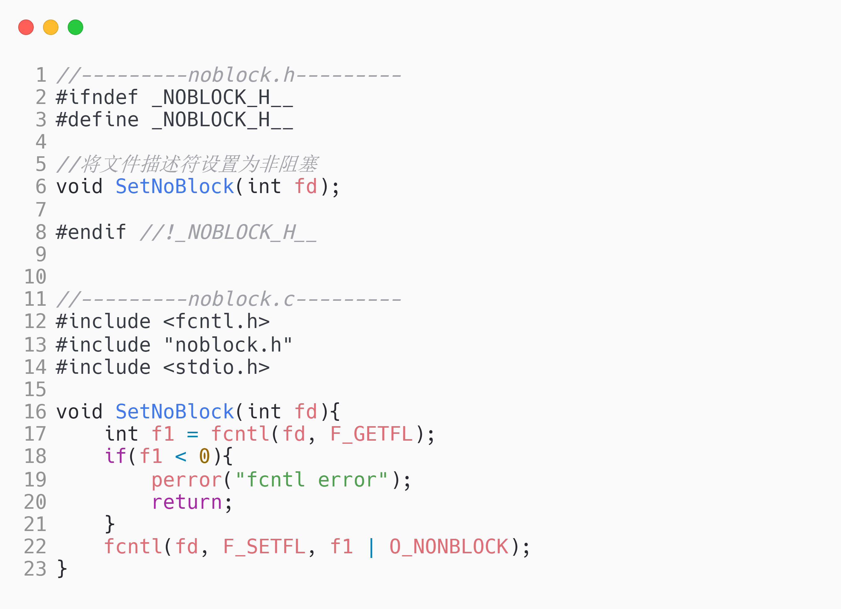 我们此处只是用第三种功能,获取/设置文件状态标记,就可以将一个文件描述符设置为非阻塞。对fcntl封装实现一个将文件描述符更改为非阻塞的功能: