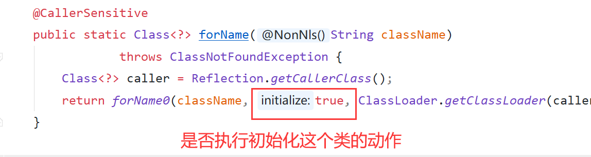 所以上述表明,使用forName显式加载可以选择是否执行初始化,如果只是传类名称的话默认是要执行初始化的,但是loadClass却没有链接和初始化的步骤,这种行为加做延迟加载,IOC为了提高启动速度就选择了使用延迟加载,在IOC容器中被广泛使用。forName什么时候用呢?比如使用MySQL驱动的时候,就是直接初始化MySQL驱动的一些对象,而不是延迟加载。