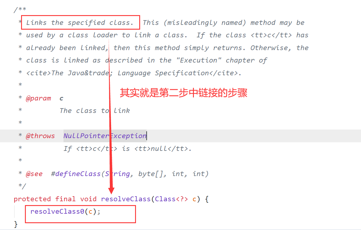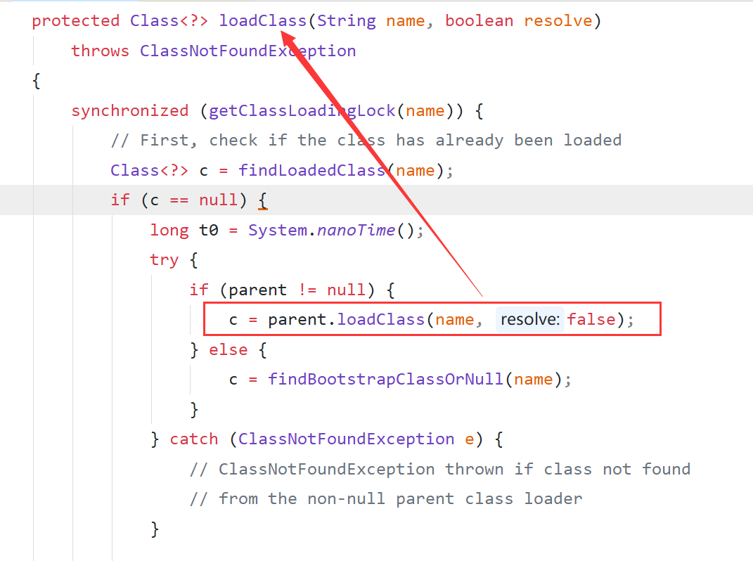 在loadClass方法中,我们注意到一个boolean类型的参数叫做resolve,false即表示不执行链接的过程,即不解析这个类。