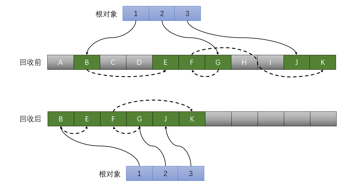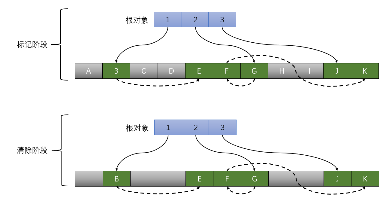 标记:从根集合进行扫描,对存活的对象进行标记。清除:移动所有存活的对象,且按照内存地址次序依次排列,然后将末端内存地址以后的内存全部回收。