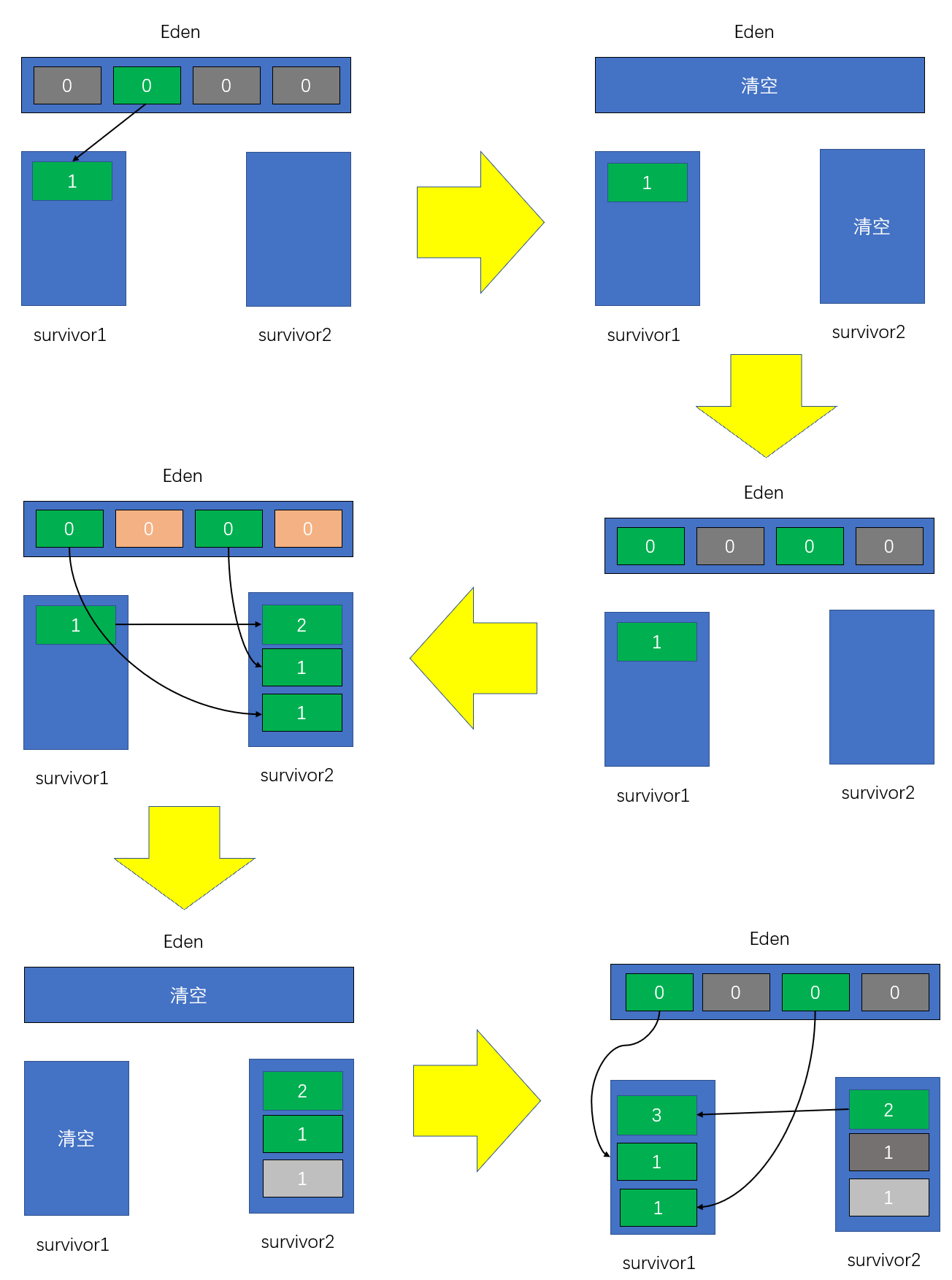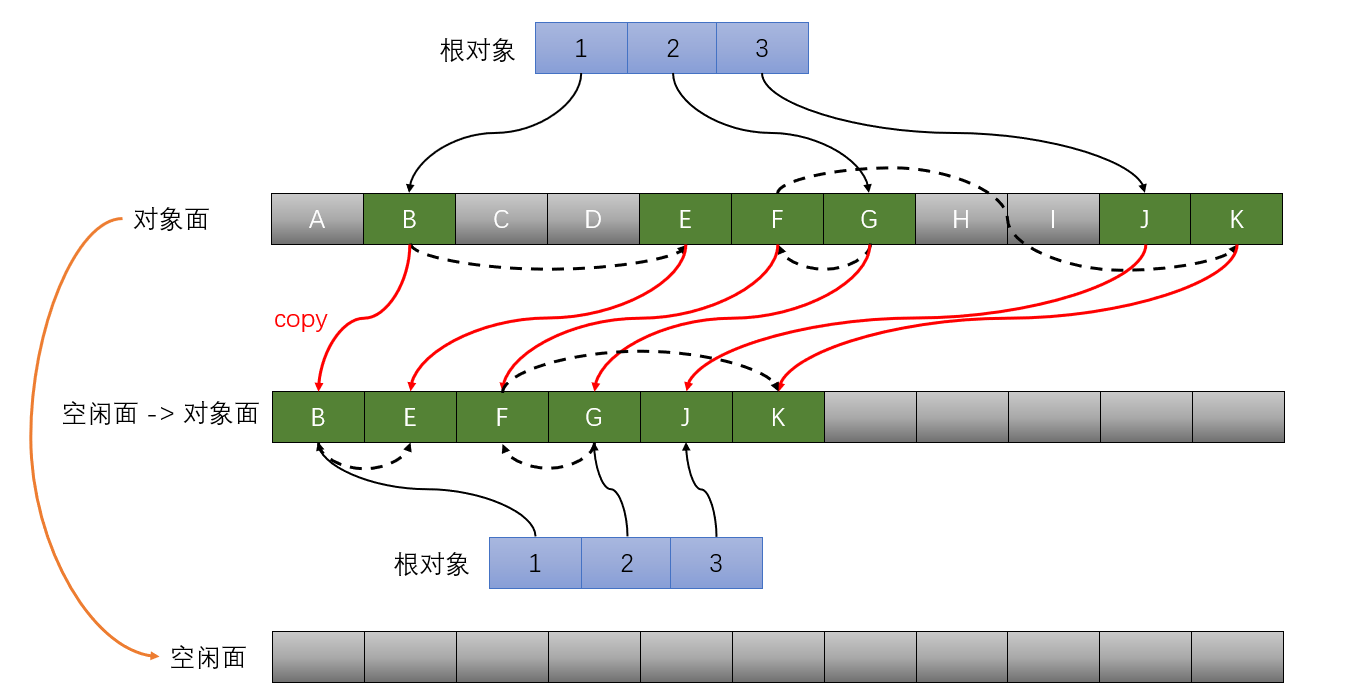 分为对象面和空闲面,对象在对象面上创建,存活的对象被从对象面复制到空闲面,将对象面所有对象内存清除,解决了内存空间碎片化的问题,合适只有少数存活对象的情况,因为只复制一小部分对象就OK了