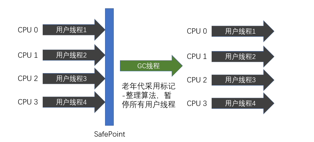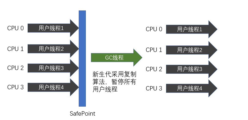 目前的垃圾收集器主要有7种,上图是他们的使用关系,连在一起的就可以配合使用。JDK11出现两种新的垃圾收集器,一个是Epsilon垃圾收集器,一个是ZGC垃圾收集器。垃圾收集器中很重要的两个概念:Stop-The-World和Safepoint。首先说说Stop-The-World:JVM由于要执行GC而停止了应用程序的执行,任何一种GC算法中都会发生。多数GC优化通过减少Stop-the -world发生的时间来提高程序性能。安全点 Safepoint:分析过程中对象引用关系不会发生变化的点,产生Safepoint的地方:方法调用、循环跳转、异常跳转等,安全点数量得适中。