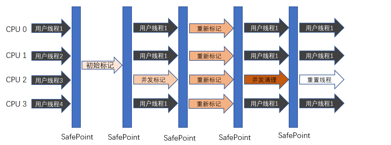 这6个步骤中初始标记和重新标记是需要暂停JVM的,是费时操作