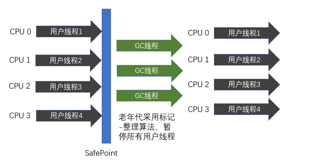 Serial Old收集器(-XX:+UseSerialOldGC,标记-整理算法),单线程收集,进行垃圾收集时,必须暂停所有工作线程。简单高效,Client模式下默认的老年代收集器。