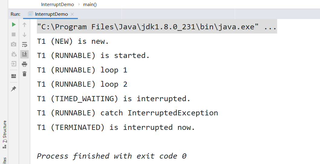 System.out.println(t1.getName() + " (" + t1.getState() + ") is interrupted.");