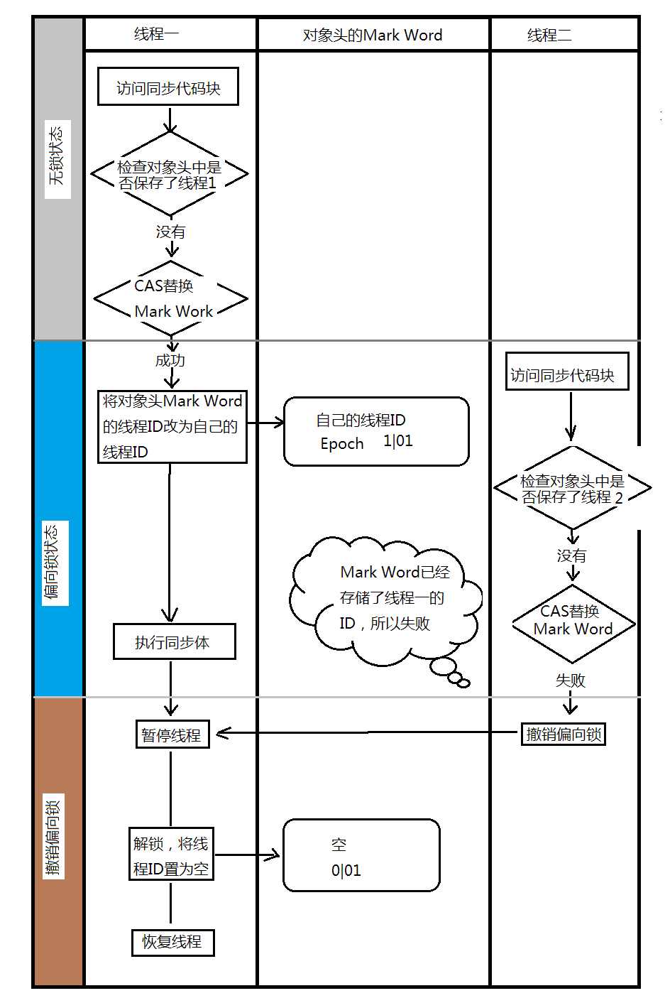 偏向锁的撤销:偏向锁使用了一种等到竞争出现才释放锁的机制, 所以当其他线程尝试竞争偏向锁时,持有偏向锁的线程才会释放锁。