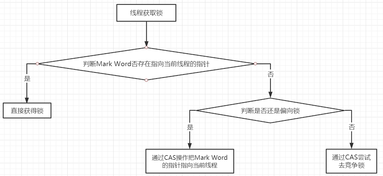 偏向锁的获取比较简单:线程在获取锁时,检测对象头的Mark Word里是否存在指向当前线程的指针,如果存在则获取所成功;如果测试失败,检查Mark Word偏向锁标识是否设置为1(也就是判断当前是否还是偏向锁),如果还是偏向锁,就通过CAS操作把Mark Word中的指针指向为当前线程。如果Mark Word偏向锁标识没有设置为1(则说明已经不是偏向锁),此时CAS尝试去竞争锁。