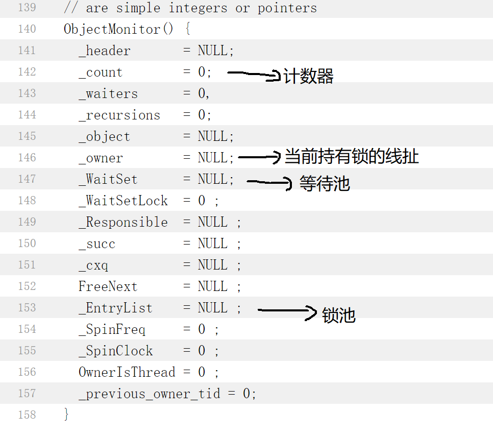这里monitorenter和monitorexit操作所对应的锁对象是隐式的。对于实例方法来说,这两个操作对应的锁对象是this;对于静态方法来说,这两个操作对应的锁对象则是所在类的Class 实例。关于monitorenter和monitorexit的作用,我们可以抽象地理解为每个锁对象拥有一个锁计数器和一 个指向持有该锁的线程的指针。其实看ObjectMonitor的源码,也就是ObjectMonitor.hpp也就能明白这一点。
