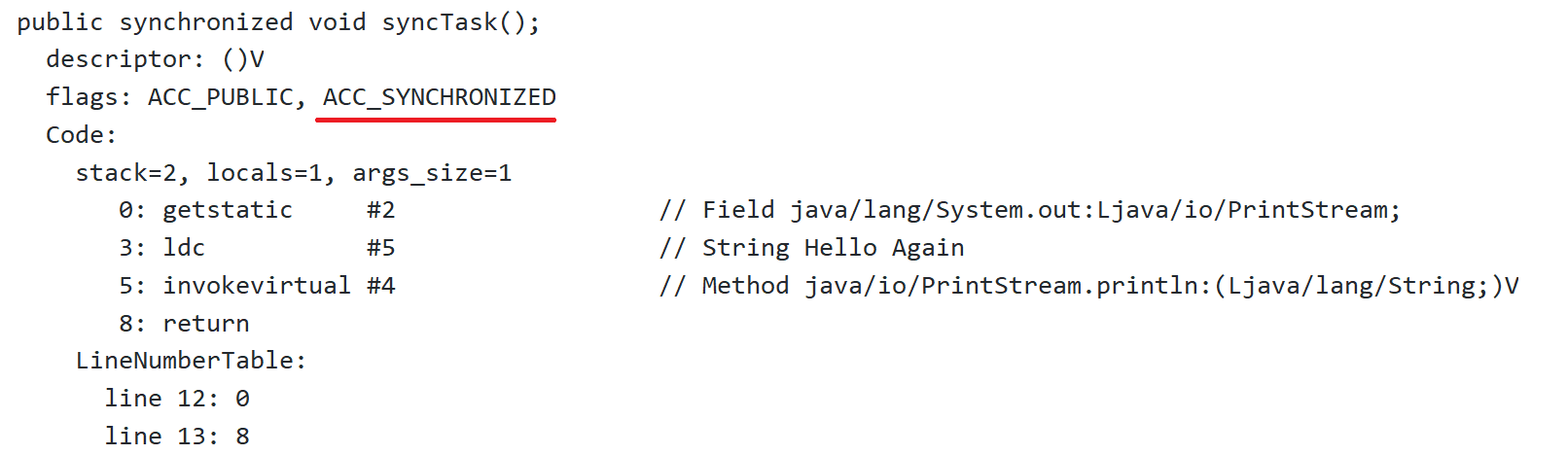 当用synchronized标记方法时,字节码中方法的访问标记包括ACC_ SYNCHRONIZED。该标记表示在进入该方法时,Java 虚拟机需要进行monitorenter操作。而在退出该方法时,不管是正常返回,还是向调用者抛异常,Java虚拟机均需要进行monitorexit操作。
