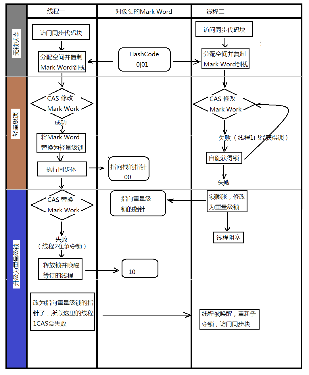 轻量级锁解锁过程:轻量级解锁时,会使用原子的CAS操作将Displaced Mark Word替换回到对象头,如果成功,则表示没有竞争发生。如果失败,表示当前锁存在竞争,锁就会膨胀成重量级锁。下图是两个线程同时争夺锁, 导致锁膨胀的流程图。