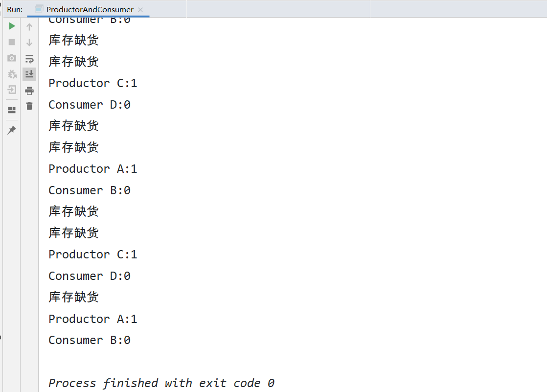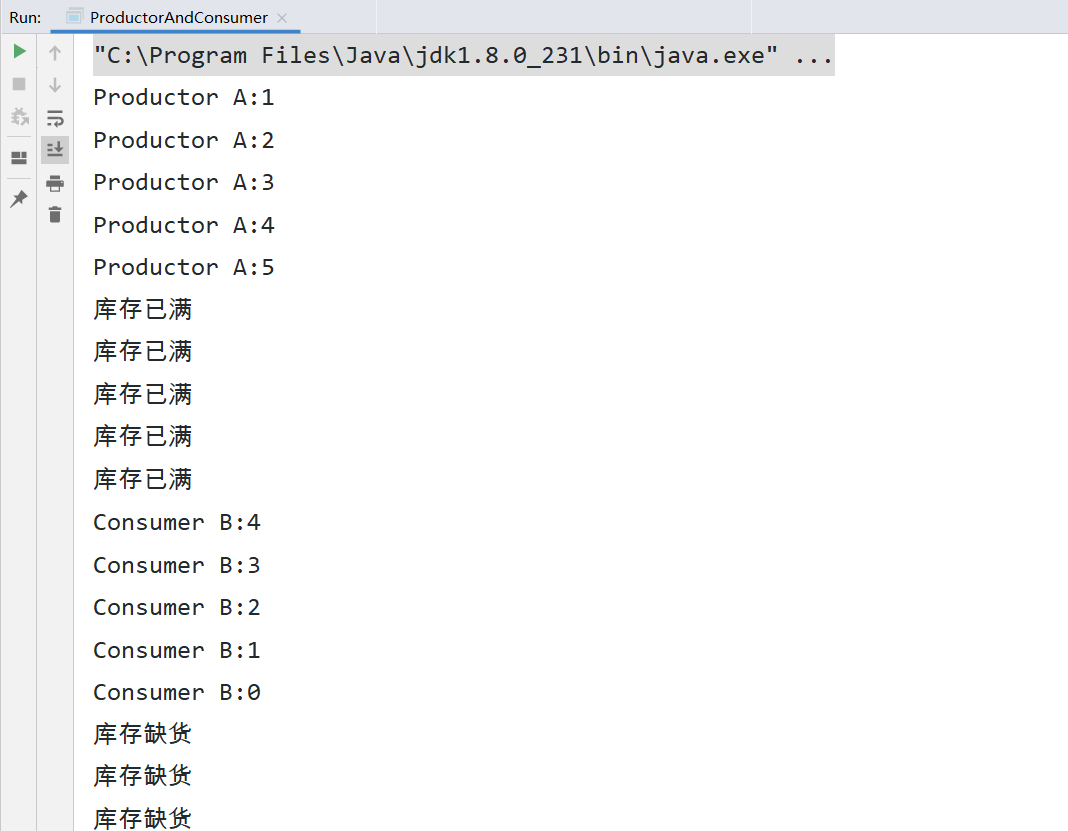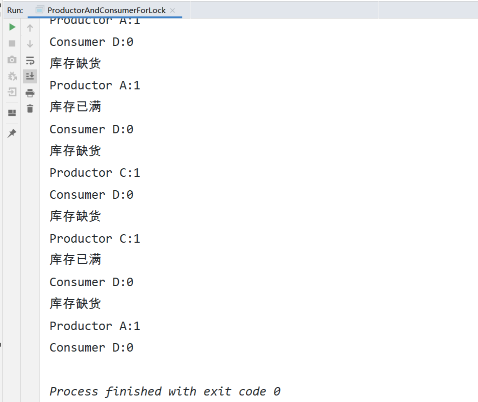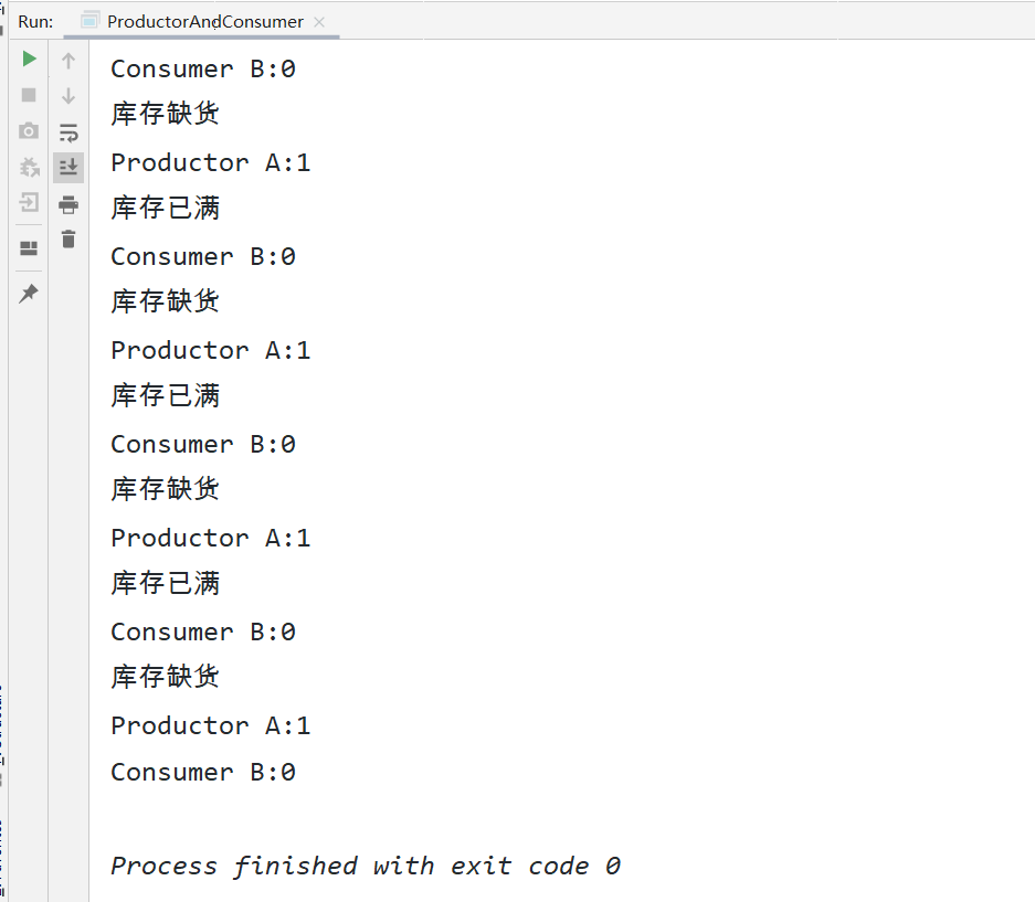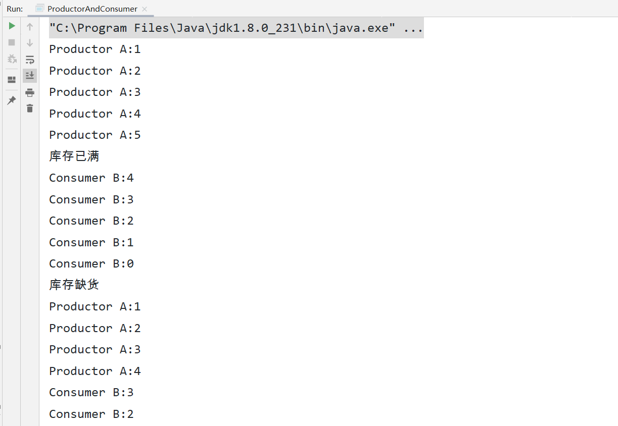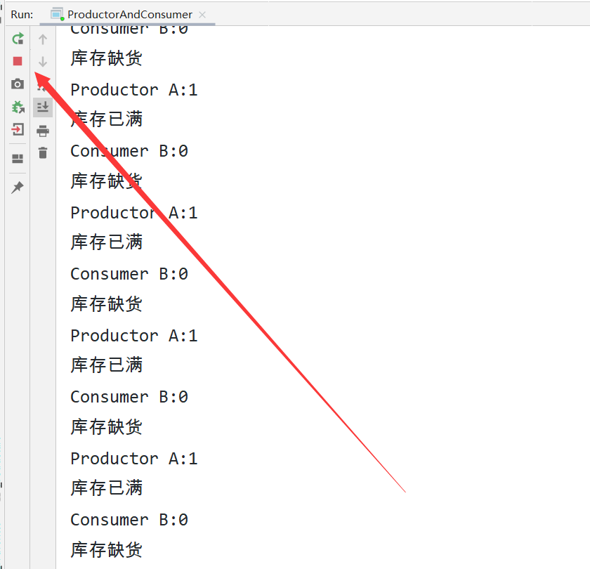 程序的输出貌似没有问题,但请注意图中箭头所指的地方,这表示程序没有结束,还一直在执行。这是因为,当循坏到最后一轮时,由于产品已满引发了wait()操作,然后生产者线程等待,随后消费者消费了一份产品,并唤醒等待的生产者线程,此时,被唤醒的生产者线程由于循环结束,直接结束了线程的执行,但是另一边,消费者线程没有结束,而且由于将产品消费完后再次进入了等待,但是生产者线程此时已经结束了,不能再唤醒消费者线程,所以便进入了死循环。