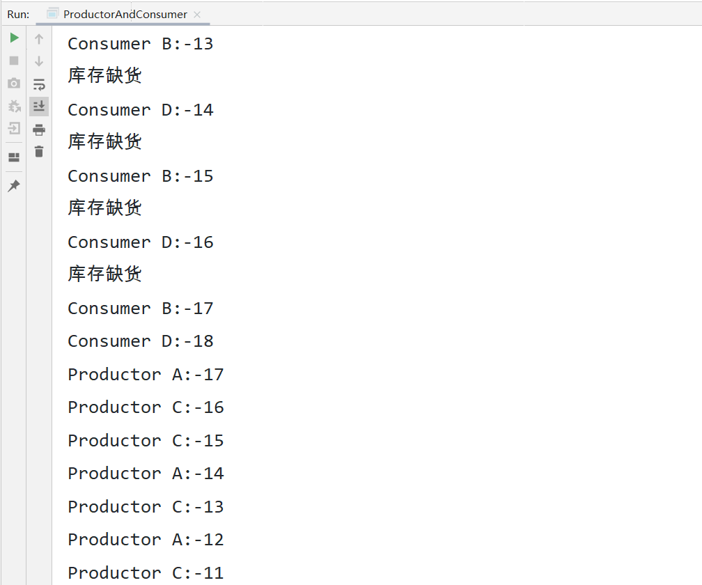 但是结果明显是不对的, 错误的原因在于,当一个消费者线程遇到产品为0时,等待,并释放锁标志,然后另外一个消费者线程获取到该锁标志,由于产品仍然为0,也等待,并释放锁标志。这时候,生产者线程获取到锁,在生产一个产品后,执行notifyAll()唤醒所有线程,这时候,一个消费者线程消费一个产品使得产品为0,另外一个消费者线程再消费一个产品使得产品变为了负数,这种现象称为虚假唤醒。