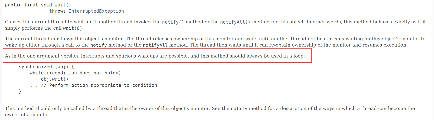 在Object.wait()方法的javadoc中叙述了该如何解决这种问题: