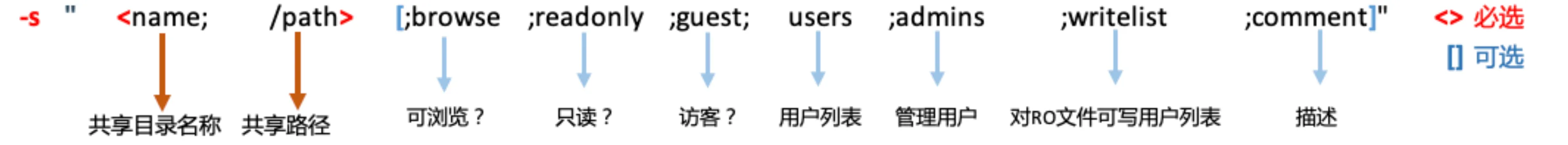 除了要指定分享目录、用户名密码以外,后面的是权限相关的参数。-s