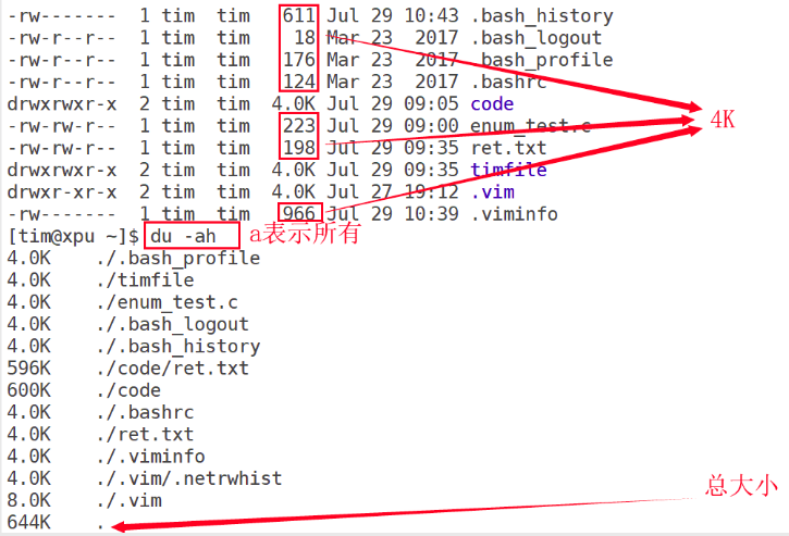 接下来看看这样一个现象,大小不一样,对于.viminfo 这个文件 ls 查看信息查出是862字节,为什么到du命令下就变成4k了?