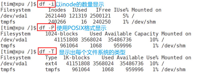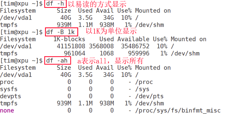 -a:–all,显示所有的文件系统,包括虚拟文件系统 -B:–block-size,指定单位大小。比如1k,1m等 -h:–human-readable,以人们易读的GB、MB、KB等格式显示。 -H:–si,和-h参数一样,但是不是以1024,而是1000,即1k=1000,而不是1k=1024。 -i:–inodes,不用硬盘容量,而是以inode的数量来显示 -k:以KB的容量显示各文件系统,相当于–block-size=1k。 -m:以KB的容量显示各文件系统,相当于–block-size=1m。 -l:–local,只显示本地文件系统。 –no-sync:在统计使用信息之前不调用sync命令(默认)。 -sync:在统计使用信息之前调用sync命令。 -P:–portability,使用POSIX格式显示 -t:–type=TYPE,只显示指定类型的文件系统. -T:–print-type,显示文件系统类型 -x:–exclude-type=TYPE,不显示指定类型的文件系统 –help:显示帮助信息。 –version:显示版本信息。