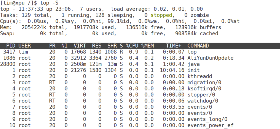 -b:以批处理模式操作 -c:显示完整的治命令 -d:屏幕刷新间隔时间 -I:忽略失效过程 -s:保密模式 -S:累积模式 -i<时间>:设置间隔时间 -u<用户名>:指定用户名 -p<进程号>:指定进程 -n<次数>:循环显示的次数