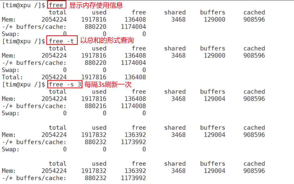 Linux free命令用于显示内存状态。 free指令会显示内存的使用情况,包括实体内存,虚拟的交换文件内存,共享内存区段,以及系统核心使用的缓冲区等。