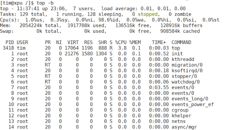将更新显示二次的结果输入到名称为 top.log 的档案里top -n 2 -b < top.log