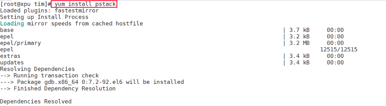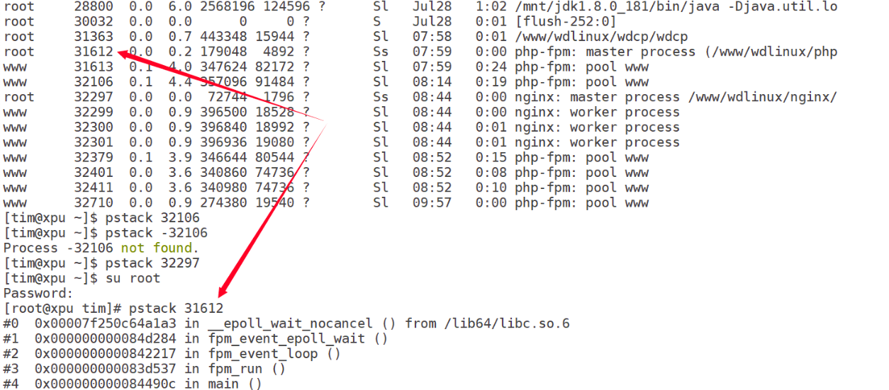 显示每个进程的栈跟踪。pstack 命令必须由相应进程的属主或 root 运行。可以使用 pstack 来确定进程挂起的位置。此命令允许使用的唯一选项是要检查的进程的 PID。 需要先安装此工具: