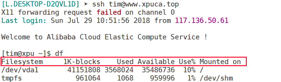 Filesystem:代表该文件系统时哪个分区,所以列出的是设备名称。 1K-blocks:说明下面的数字单位是1KB,可利用-h或-m来改变单位大小,也可以用-B来设置。 Used:已经使用的空间大小。 Available:剩余的空间大小。 Use%:磁盘使用率。如果使用率在90%以上时,就需要注意了,避免磁盘容量不足出现系统问题,尤其是对于文件内容增加较快的情况(如/home、/var/spool/mail等)。 Mounted on:磁盘挂载的目录,即该磁盘挂载到了哪个目录下面。
