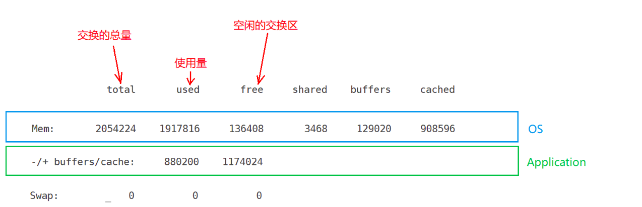 free输出的第三行是从一个应用程序的角度看系统内存的使用情况。 对于-buffers/cache,表示一个应用程序认为系统被用掉多少内存; 对于+buffers/cache,表示一个应用程序认为系统还有多少内存; 因为被系统cache和buffer占用的内存可以被快速回收,所以通常+buffers/cache比-buffers/cache会大很多!