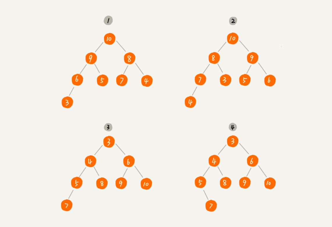 堆是一种特殊的树。我们现在就来看看,什么样的树才是堆。我罗列了两点要求,只要满足这两点,它就是一个堆。