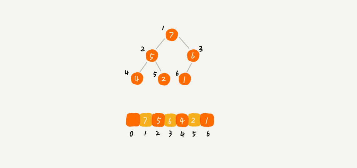 完全二叉树比较适合用数组来存储。用数组来存储完全二叉树是非常节省存储空间的。因为我们不需要存储左右子节点的指针,单纯地通过数组的下标,就可以找到一个节点的左右子节点和父节点。 如下图所示: