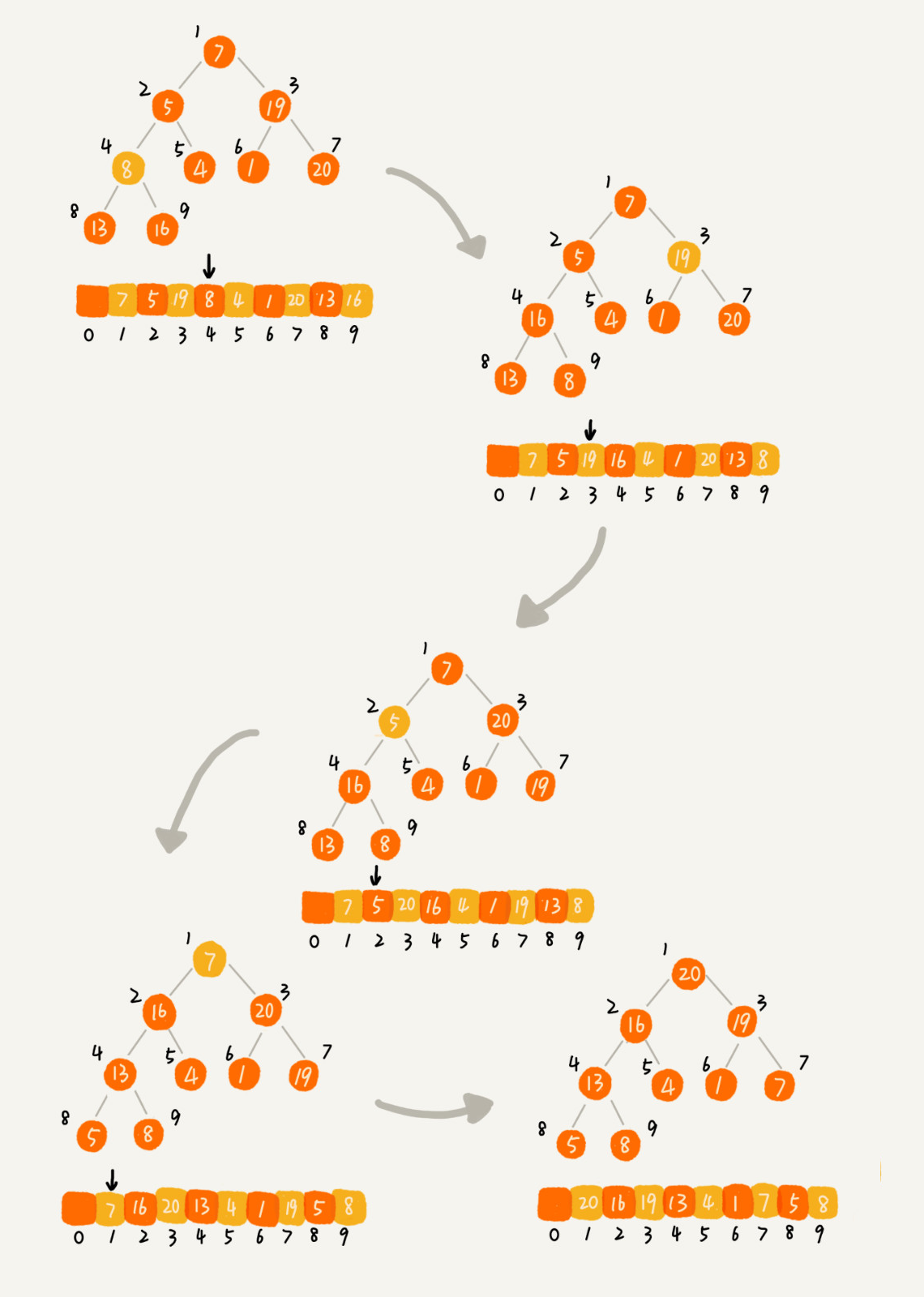 可以看出,我们不断插入数据的时候其实就是不断调堆的过程。