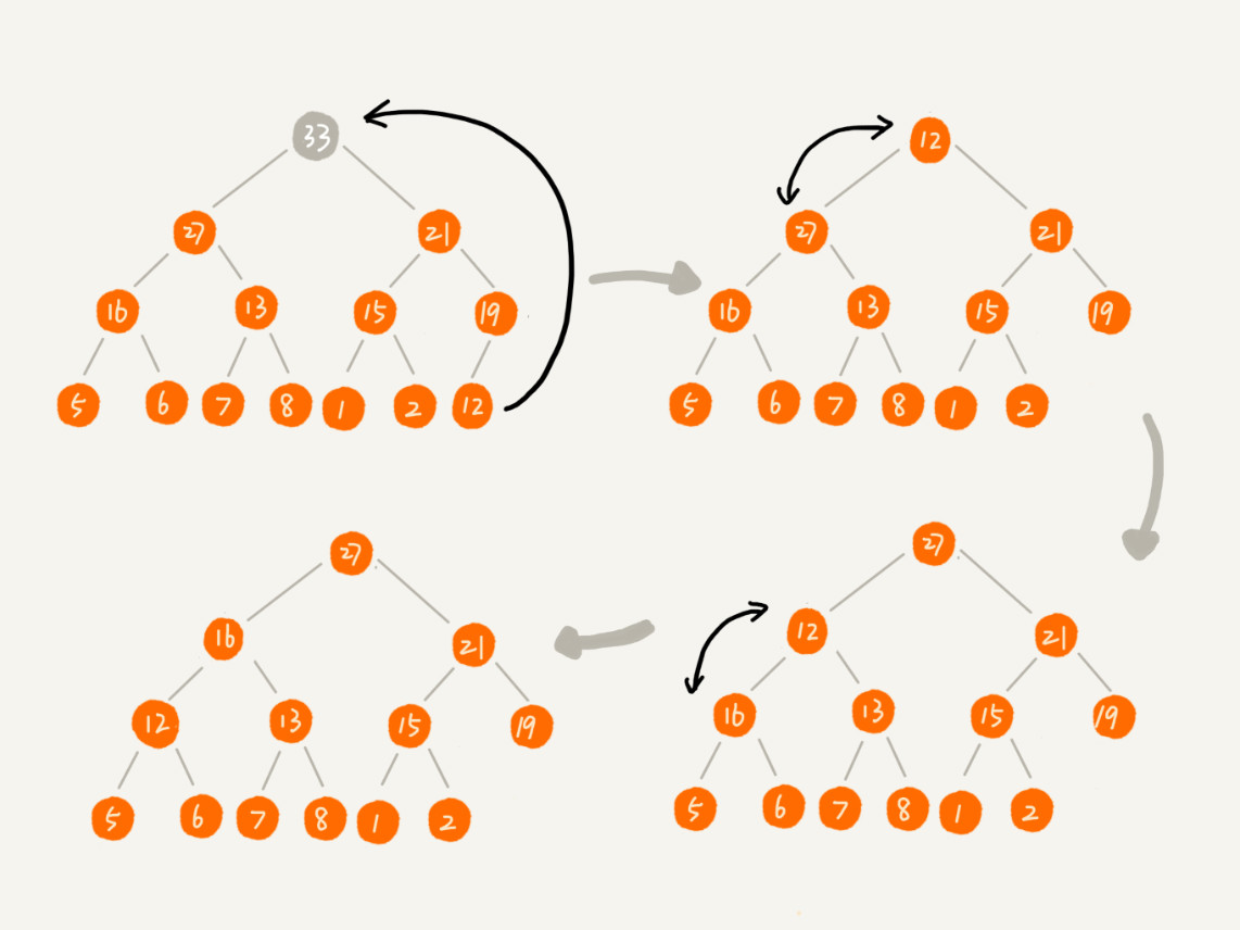 取出堆顶元素,任然需要维持堆的特性,所以我们只把最后一个节点放到堆顶,然后利用同样的父子节点对比方法。对于不满足父子节点大小关系的,互换两个节点,并且重复进行这个过程,直到父子节点之间满足大小关系为止。这就是从上往下的堆化方法,也叫做向下调堆。
