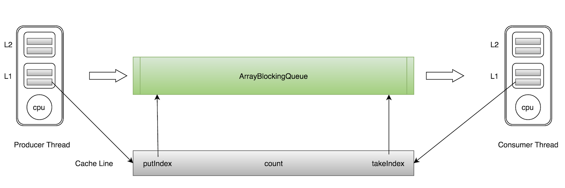 在 ArrayBlockingQueue 中,takeIndex、putIndex、count 这三个变量很容易放到一个缓存行中, 但是之间修改没有太多的关联. 所以每次修改, 都会使之前缓存的数据失效, 从而不能完全达到共享的效果。当生产者线程put一个元素到 ArrayBlockingQueue 时, putIndex 会修改, 从而导致消费者线程的缓存中的缓存行无效, 需要从主存中重新读取,这就是在 ArrayBlockingQueue 中的伪共享问题。