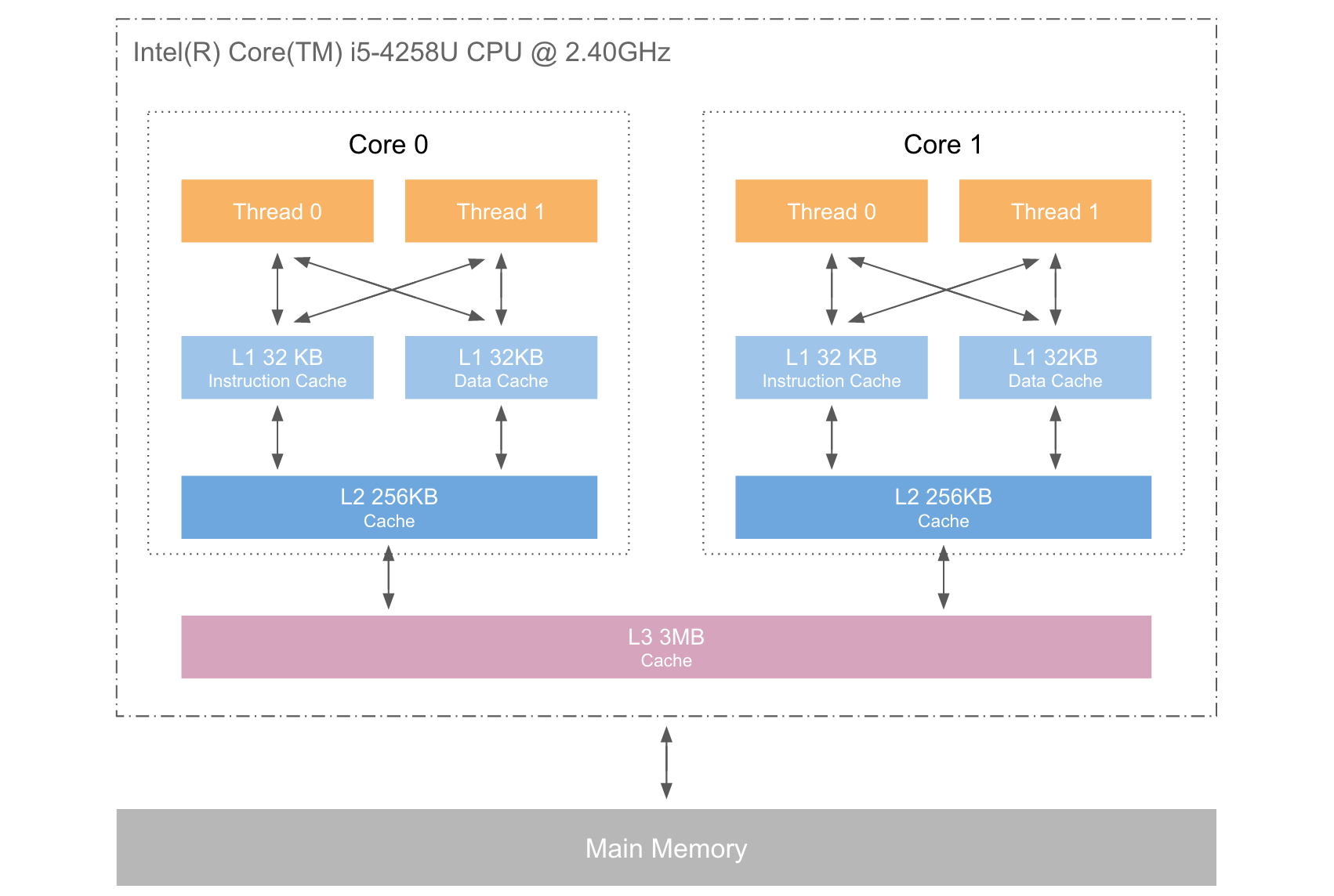 下图是CPU的3级缓存基本结构,L1、L2、L3分别表示一级缓存、二级缓存、三级缓存,越靠近CPU的缓存,速度越快,容量也越小。所以L1缓存很小但很快,并且紧靠着在使用它的CPU内核;L2大一些,也慢一些,并且仍然只能被一个单独的CPU核使用;L3更大、更慢,并且被单个插槽上的所有CPU核共享;最后是主存,由全部插槽上的所有CPU核共享。