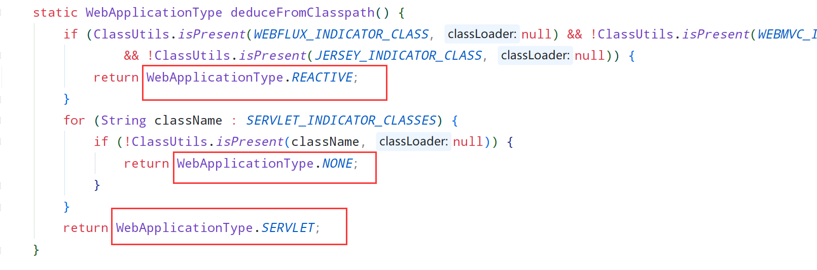 1、deduceFromClasspath:用来推断应用的类型:创建的是 REACTIVE应用、SERVLET应用、NONE 三种中的一种
