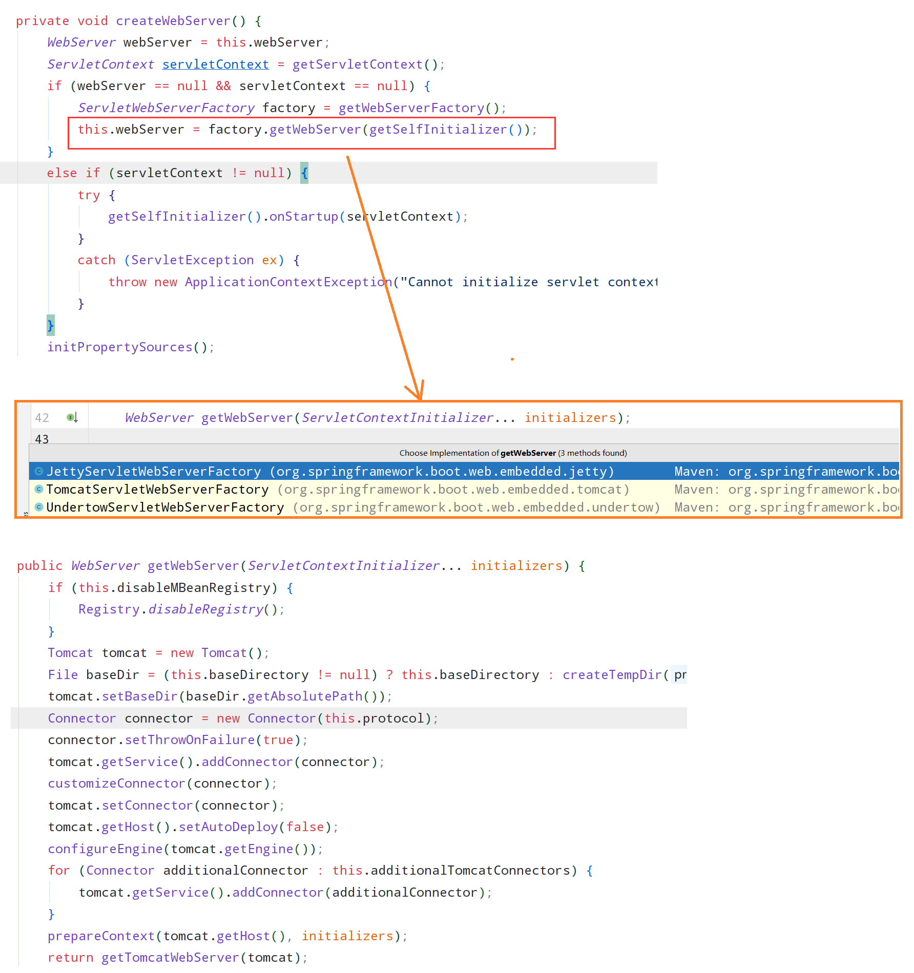 我们继续看下getWebServletFactory() 这个方法,这个里面其实就是选择出哪种类型的web容器了: