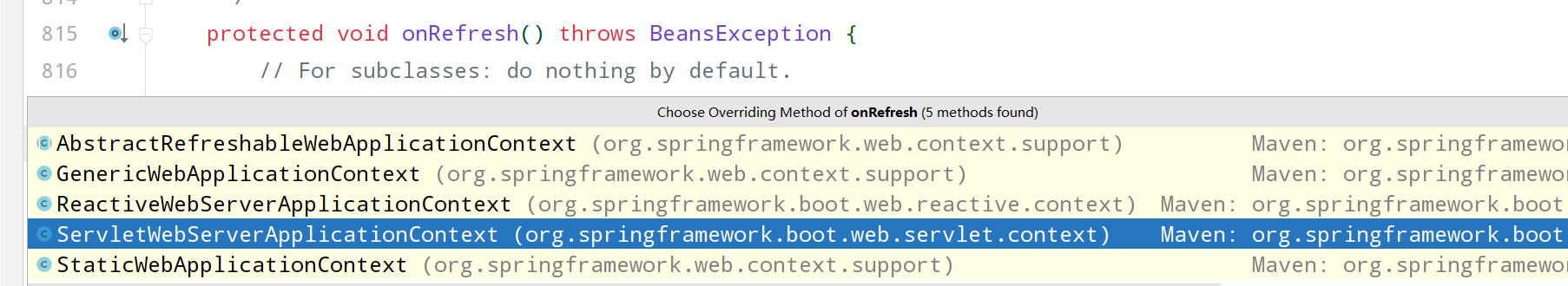 我们可以看到一个onRefresh方法,点进去需要看的是子类实现,我们只看其中一个子类实现: