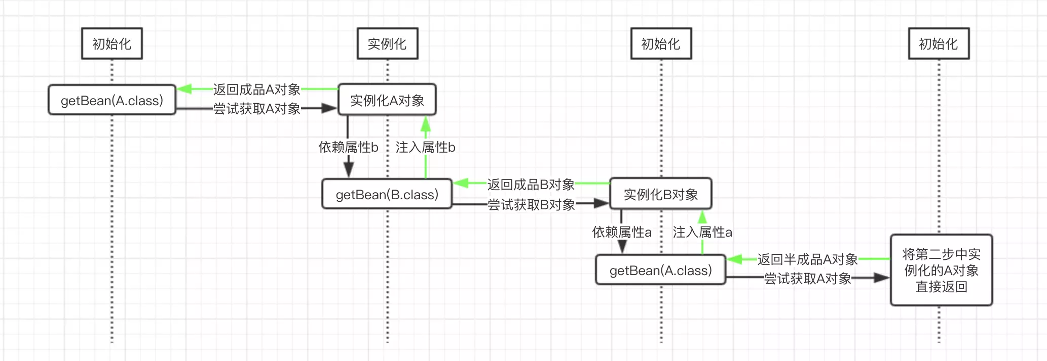 图中getBean()表示调用Spring的ApplicationContext.getBean()方法,而该方法中的参数,则表示我们要尝试获取的目标对象。图中的黑色箭头表示一开始的方法调用走向,走到最后,返回了Spring中缓存的A对象之后,表示递归调用返回了,此时使用绿色的箭头表示。从图中我们可以很清楚的看到,B对象的a属性是在第三步中注入的半成品A对象,而A对象的b属性是在第二步中注入的成品B对象,此时半成品的A对象也就变成了成品的A对象,因为其属性已经设置完成了。