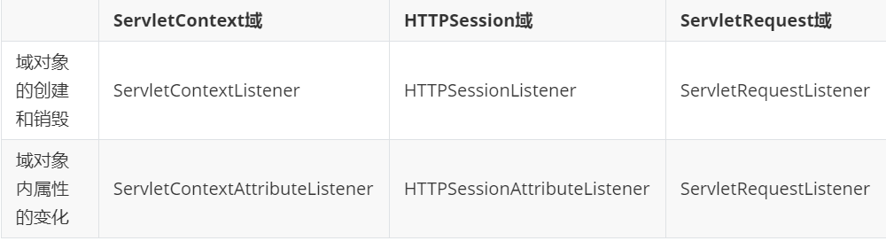 第一维度:按照被监听的对象划分:ServletRequest域 HttpSession域 ServletContext域 第二维度:监听的内容分:监听域对象的创建与销毁的 监听域对象的属性变化的