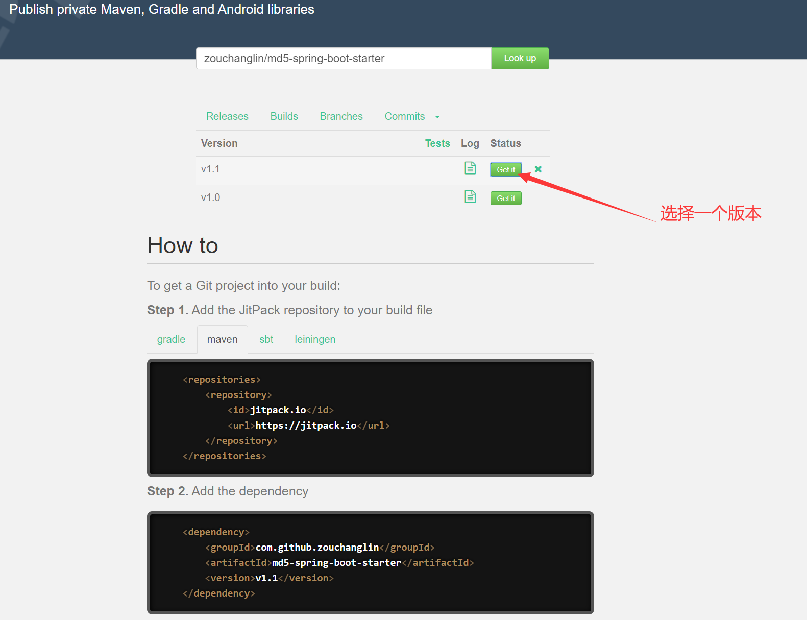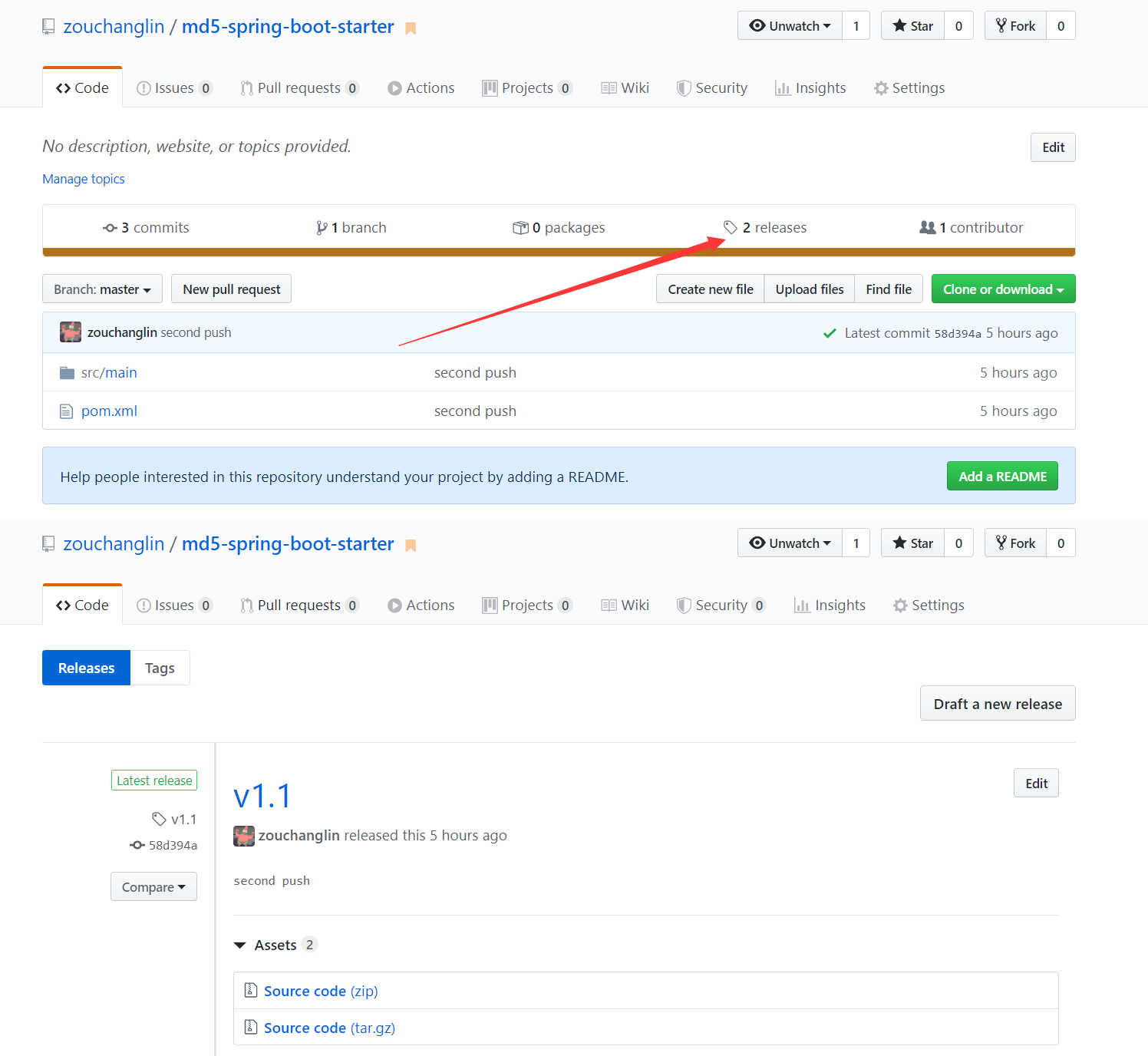 这个步骤比较容器,我们选择JitPack,JitPack在得到我们的GitHub账户授权之后可以拉取我们的仓库里的代码,我们只需要把项目放在GitHub上,并且打一个Tag(其实就是发布一个Release版本),我以我之前测试的MD5的一个starter来说,md5-spring-boot-starter ,只需要有发布版本即可: