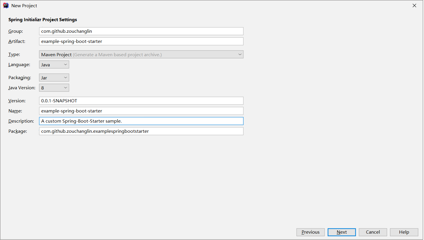 其实就是创建一个普通的SpringBoot项目,无论是用Gradle还是Maven都可以,我这里选择的是Maven的方式,只不过项目的命名方式略微有所不同,因为Spring官方的starter命令为spring-boot-starter-xxx,所以我们开发的项目不要以spring-boot开头。 建议写成:xxx-spring-boot-starter,代表我们这是一个非官方的SpringBootStarter。