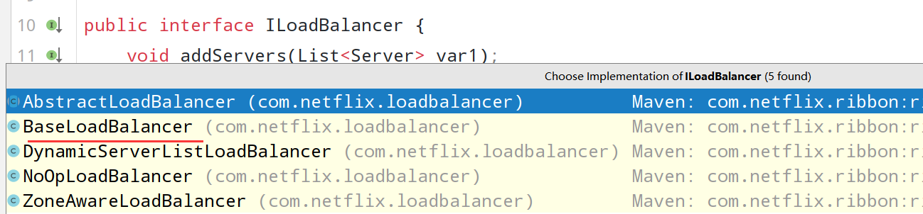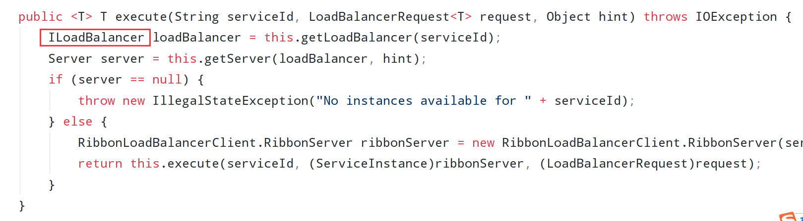 接下来我们去看看LoadBalancerClient的具体实现 —— RibbonLoadBalancerClient:在execute方法的具体视线中,不难发现首先获取到的就是ILoadBalancer: