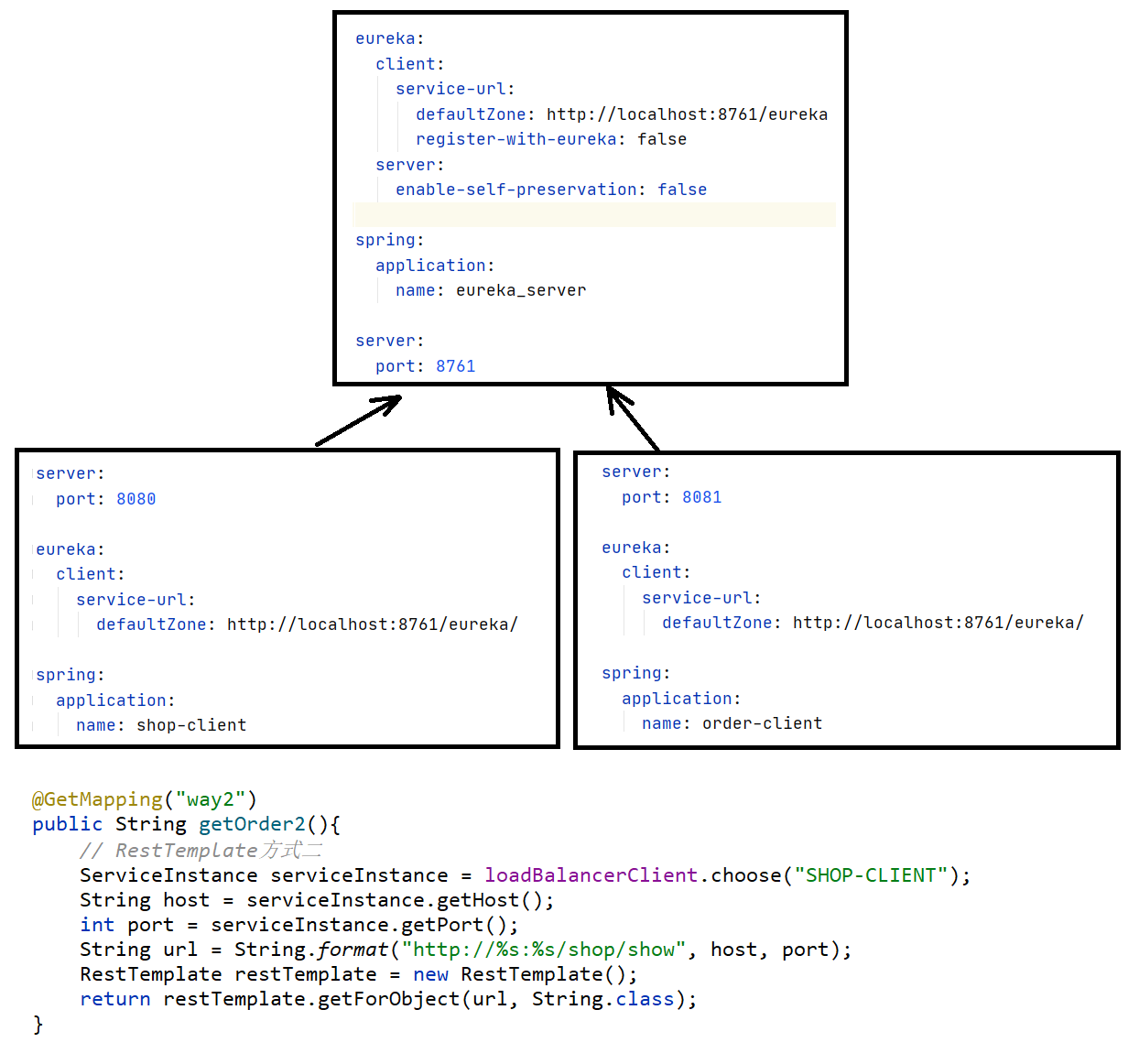 使用LoadBalancerClient的choose()获得ServiceInstance,也就是这两个应用必须先向Eureka Server注册,然后通过Client的名称来选择对应的服务实例: