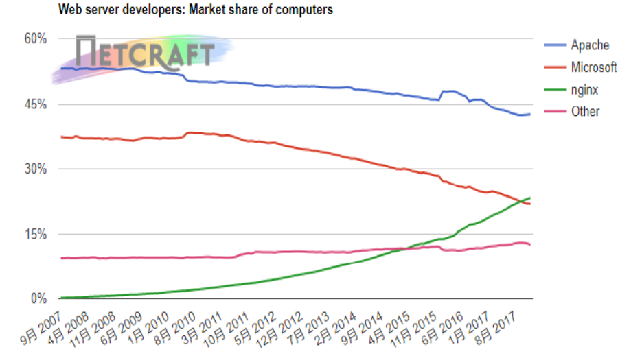 虽然现在排名第二,但是在一些追求长期稳定的服务中通常不会更换服务器,就比如学校的教务网站,ASP.NET实现的,虽然每次网上选课系统都会崩盘,但是学校为了稳定性不会轻易更换服务架构的。所以表面看起来Apache的使用高于Nginx的,但是往往新增的服务器都会使用Nginx