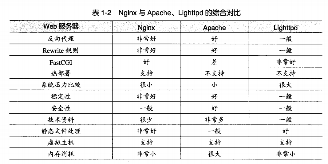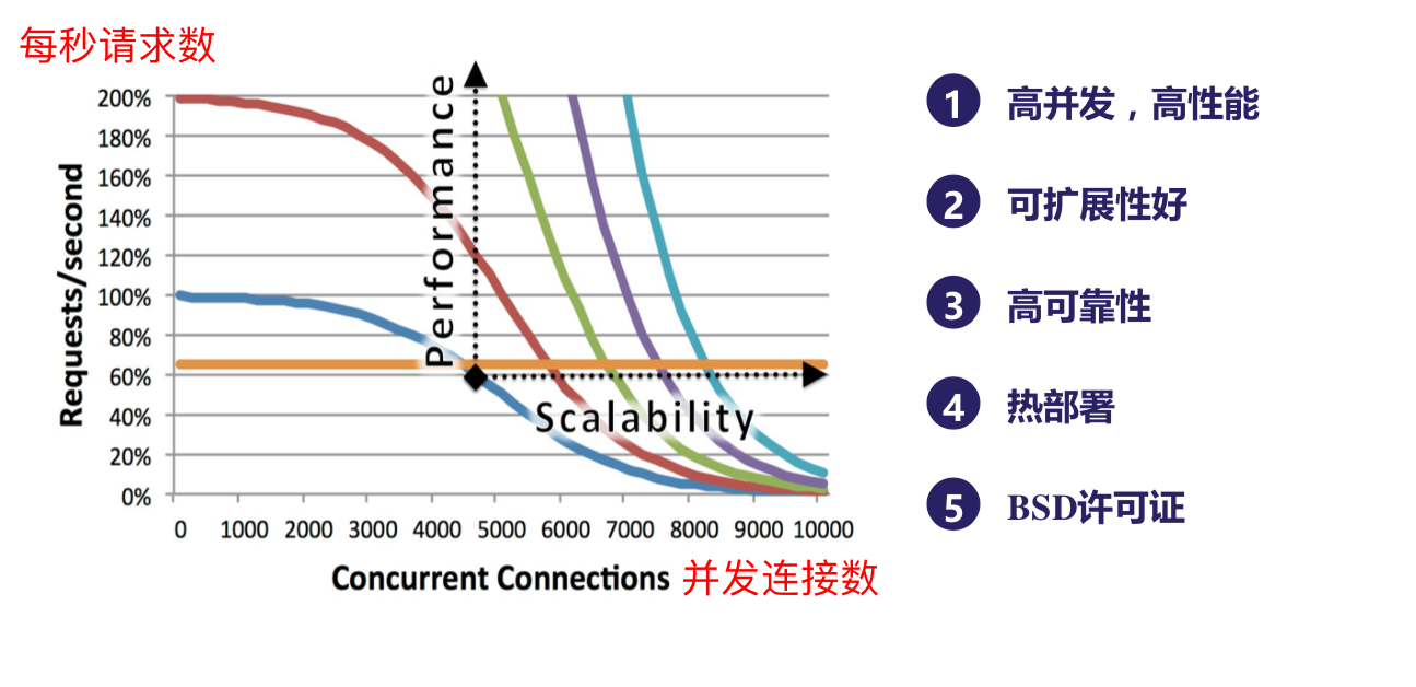 高并发需要条件就是每个链接需要更小的内存,吃更少的CPU资源。Nginx做到了,从上图中可以看到,在并发量很低的时候Nginx的性能其实还不如其他的服务器,但是Nginx在高并发量的时候,性能仍然很稳定,而其他的服务器的性能会严重下降,所以Nginx的高并发性能成为了人们选择Nginx的理由