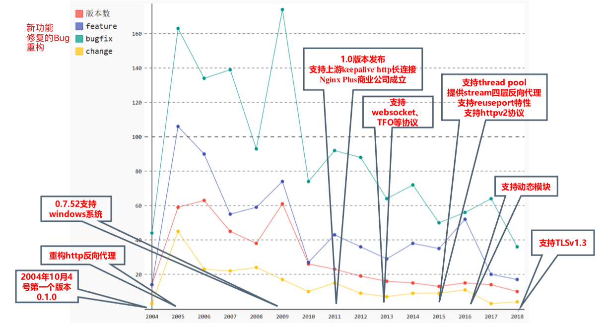 从这个图上呢也可以看出来Nginx的版本迭代情况,绿色的线表示Nginx的Bug修复情况,Bug越来越少也同样是说明了Nginx越来越稳定了,2009年Nginx开始支持Windows操作系统,2011年才成立Nginx的商业公司……