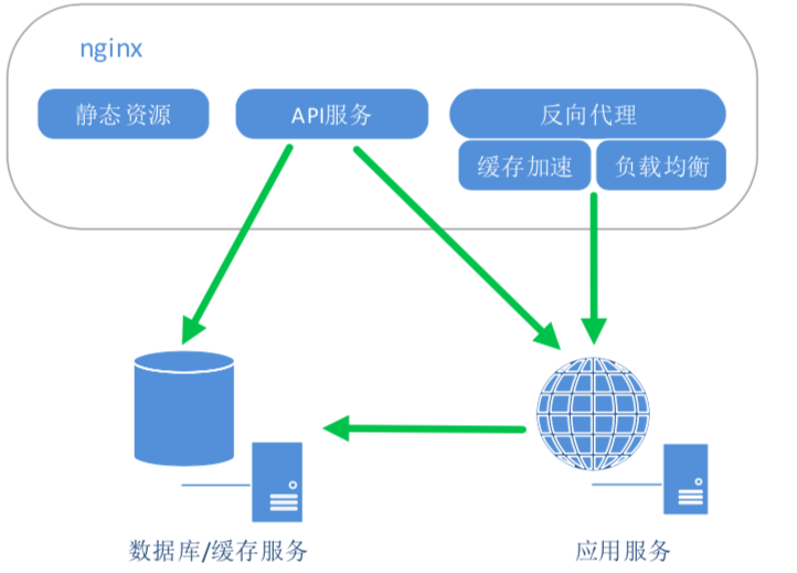 Nginx里面提供了数据库服务、缓存、应用服务相关API,模块化设计。比如数据库服务器的并发性能本来就远高于应用服务器,如果直接让应用服务器去操作数据库的话无疑是降低了系统的性能,于是Nginx提供了数据库访问的API,提升系统整体性能